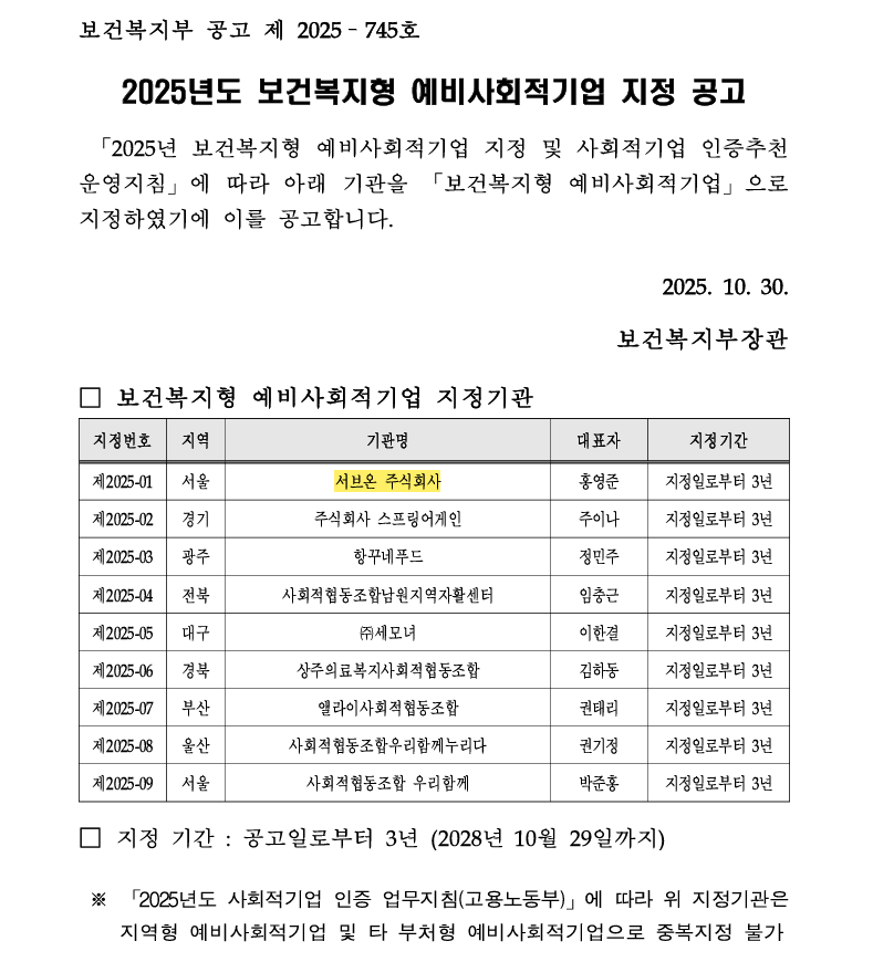2025-10-31서브온(주)_2025년도 보건복지부 예비사회적기업 지정