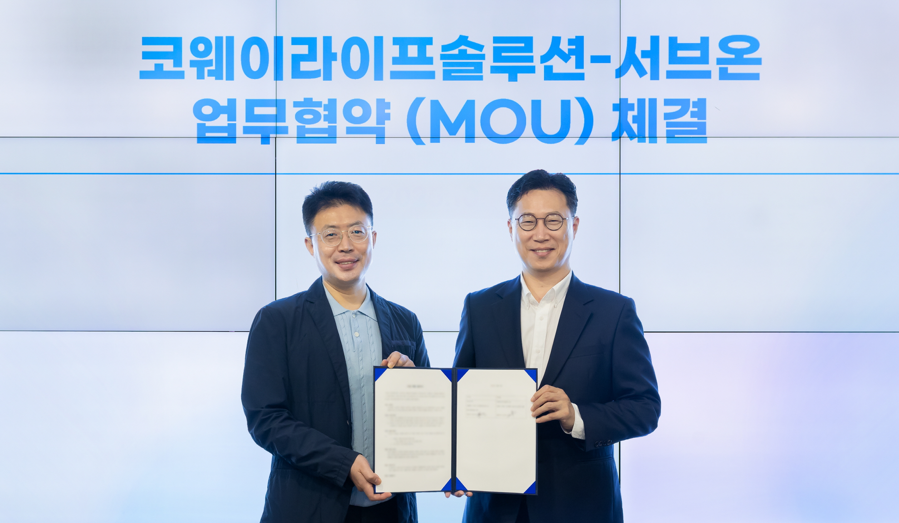 2025년 10월 15일 홍영준 서브온 대표이사(오른쪽)과 김명곤 코라솔 대표이사(왼쪽)가 서울 구로구 소재 코라솔 본사에서 열린 협약식에서 기념 촬영을 하고 있다.